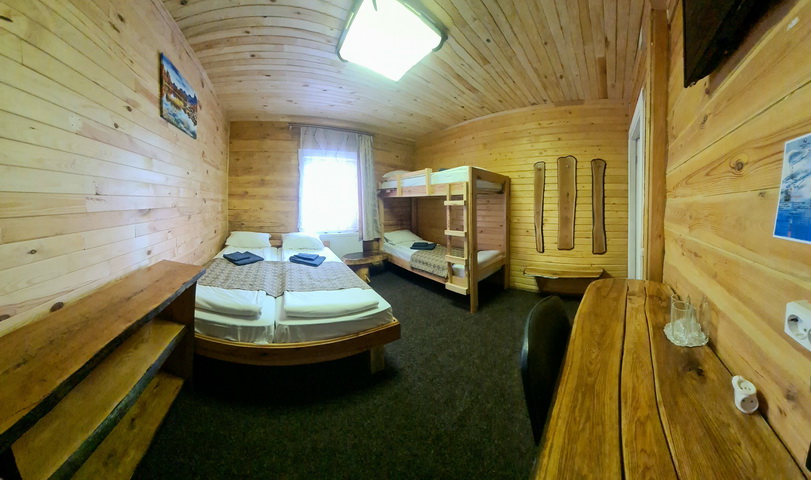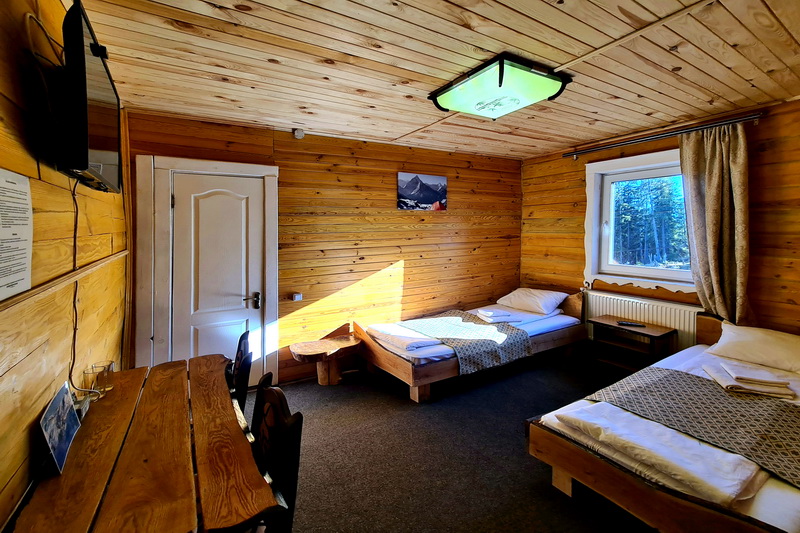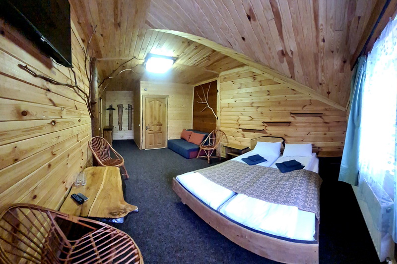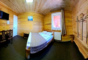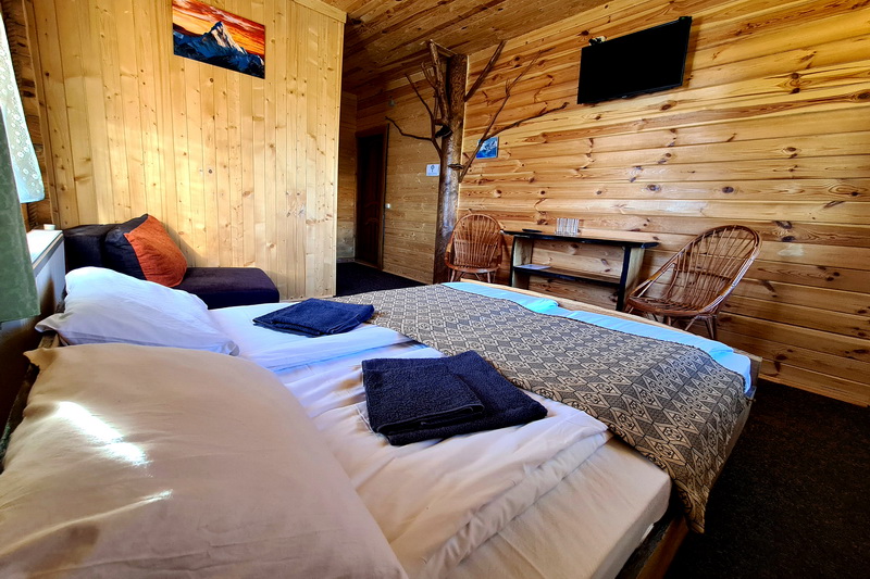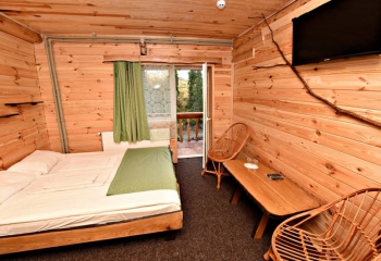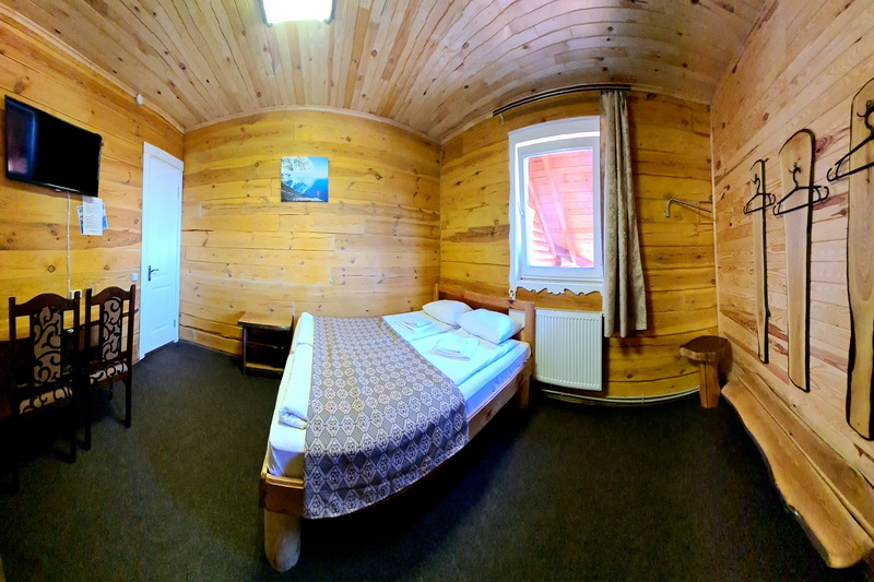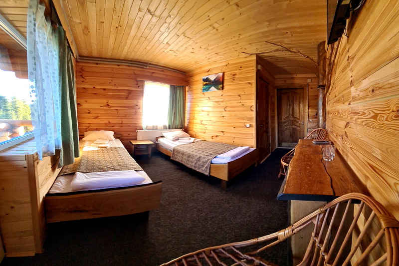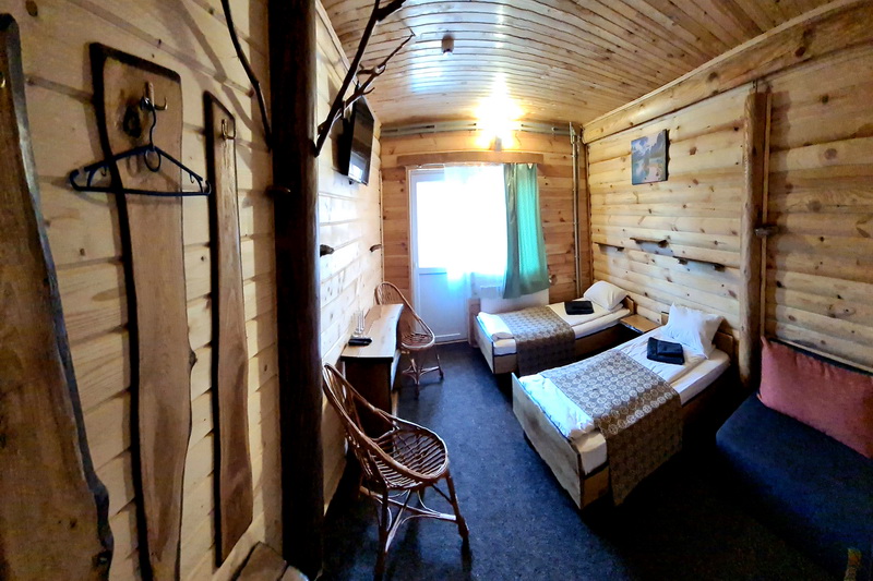 - В усіх номерах є: телевізор 32 дюйми, душова кабіна, ліжка, постільна білизна, рушники, столик, вішалки
