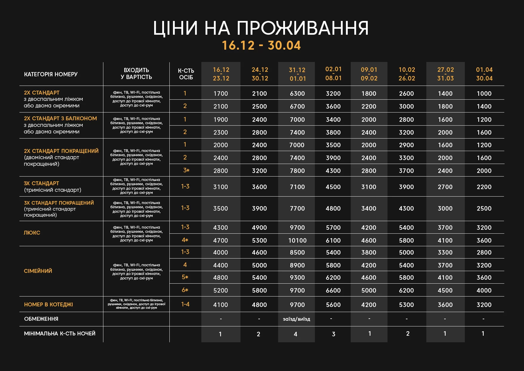 Послуги: ресторан, лаунж хол, сауна, карпатські чани, прокат лижного спорядження.
