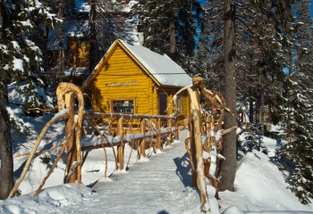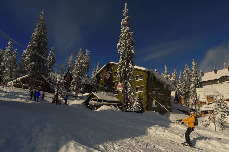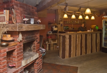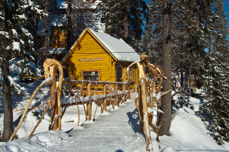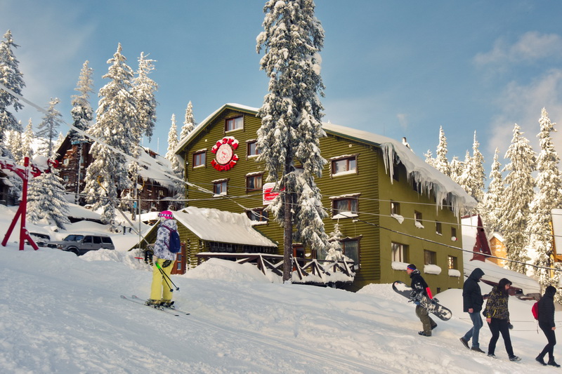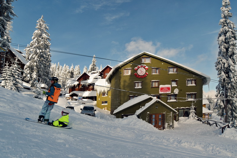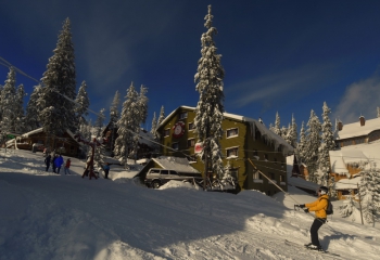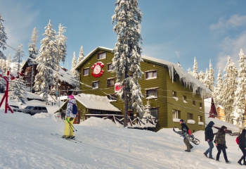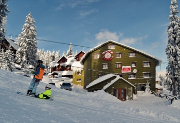 На першому поверсі розміщені бар, ресторан на 70 місць, прокат лиж.
