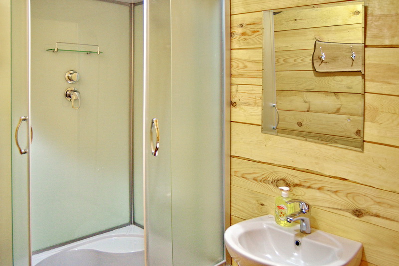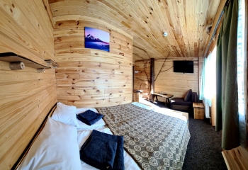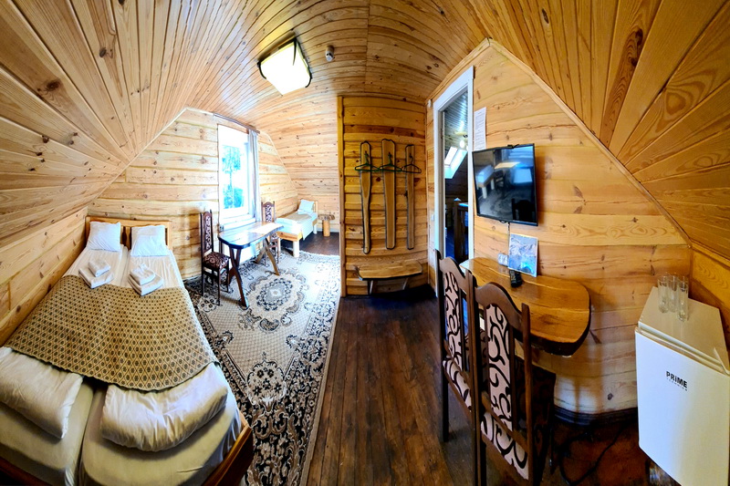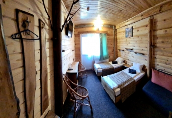 - В усіх номерах є: телевізор 32 дюйми, душова кабіна, ліжка, постільна білизна, рушники, столик, вішалки