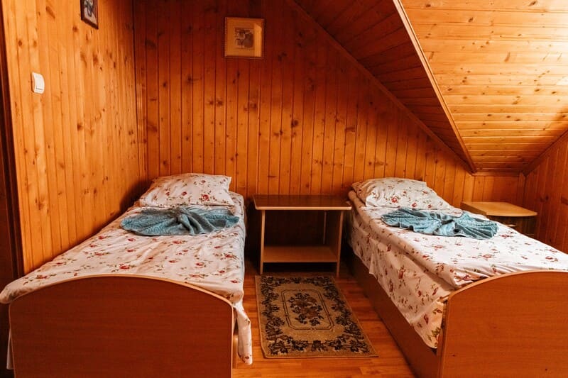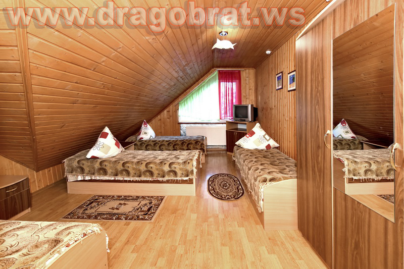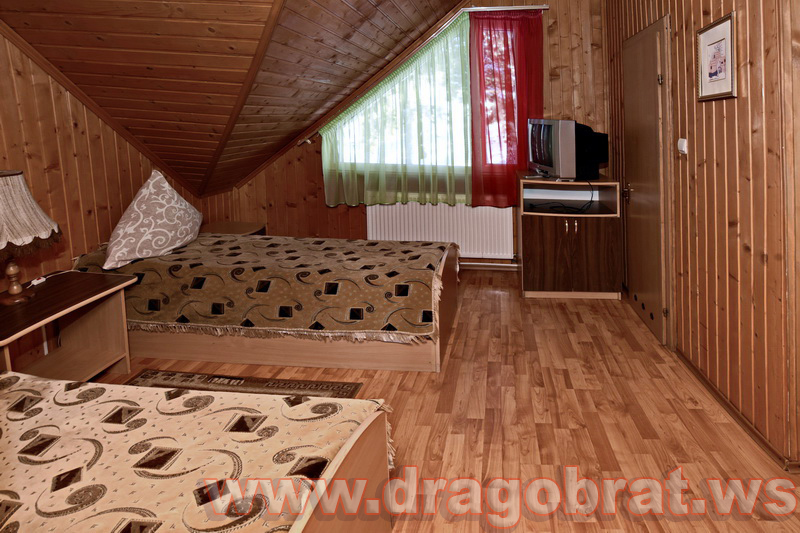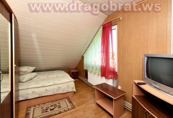 "2-місний мансард" - 2 шт. - однокімнатний, 2-х місний номер, загальна площа - 10-12м.кв., одне двоспальне ліжко, супутникове ТБ, санвузол.